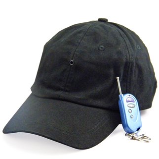 Spy camera cap, It holds 4GB of memory, and comes with a remote control and is installed with a vibrating mechanism programmed to activate for set reminders.